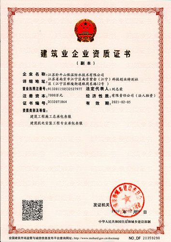 【江蘇臥牛山順利獲得“建筑工程施工總承包三級資質(zhì)”】 2016年12月,經(jīng)國家住房和城鄉(xiāng)建設(shè)部審核批準(zhǔn),公司順利獲得建筑工程施工總承包三級資質(zhì),這是公司繼防水防腐保溫工程專業(yè)承包一級資質(zhì)、建筑裝修裝飾工程專業(yè)承包二級資質(zhì)、建筑幕墻工程專業(yè)承包二級資質(zhì)及建筑機(jī)電安裝工程專業(yè)承包三級資質(zhì)后又一重要資質(zhì)的獲得。