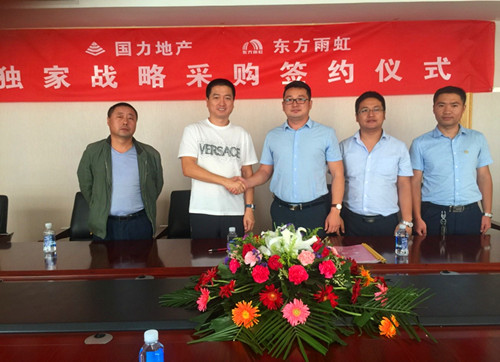 8月26日上午,東方雨虹與忻州國力房地產開發有限公司在忻州國力地產總部簽訂防水材料戰略合作協議,忻州國力地產董事長王英杰先生、東方雨虹工程渠道事業部山西省總經理孫厚軍先生出席本次簽約儀式。 在簽約儀式上,王英杰先生對東方雨虹的產品質量及企業文化給予了高度認可。孫厚軍先生對此表示感謝,并表示公司會在提供防水材料基礎上,以兩化戰略——品牌效應放大化、系統服務精細化為主導,把東方雨虹的技術優勢延伸到國力地產。